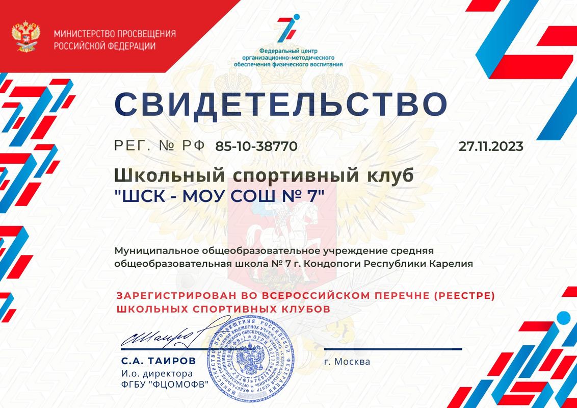 ШСК «Юность» функционирует на базе МОУ СОШ № 7 г. Кондопоги РК с сентября 2022 года. Клуб создан с целью организации и проведения спортивно-массовой и физкультурно-оздоровительной работы в школе во внеурочное время.